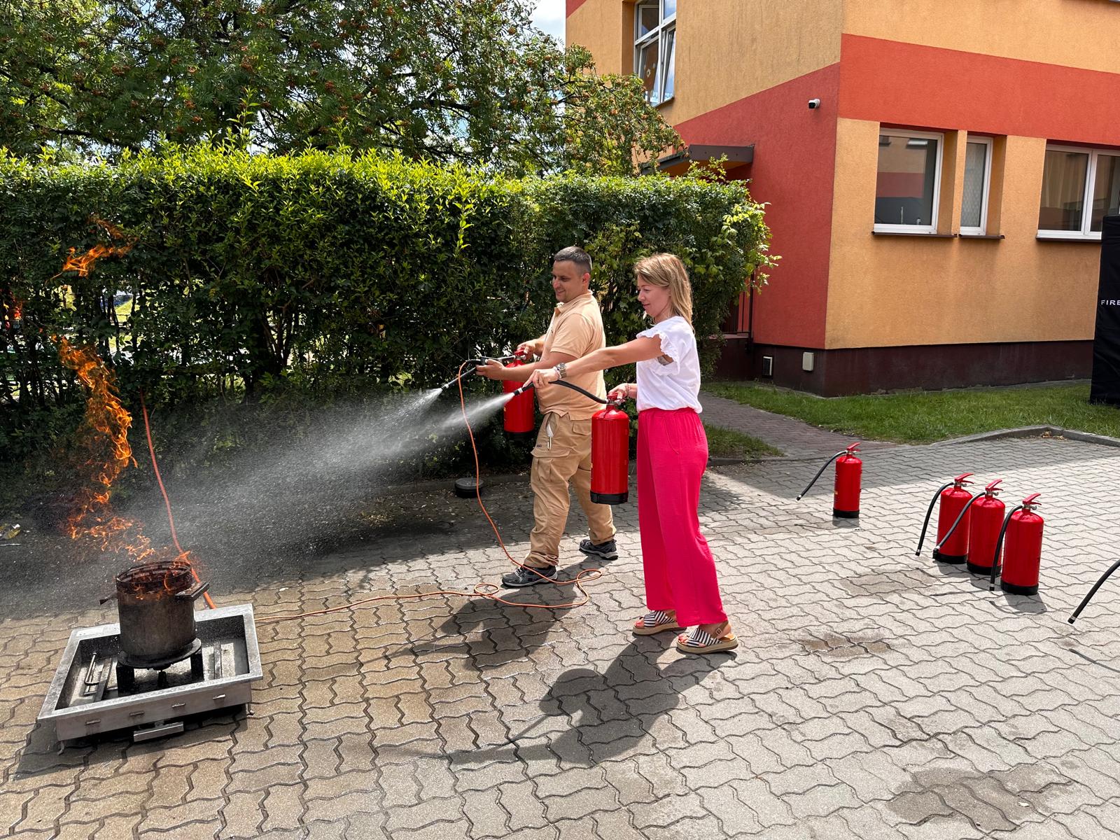 Wykorzystujemy symulator pożarów Aisco E 100, który zapewnia bezpieczne warunki do nauki efektywnych działań gaśniczych i ewakuacyjnych.